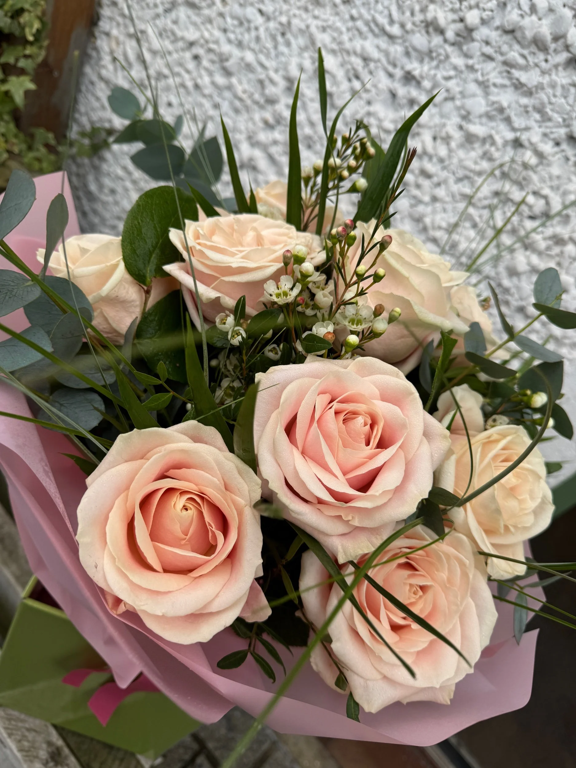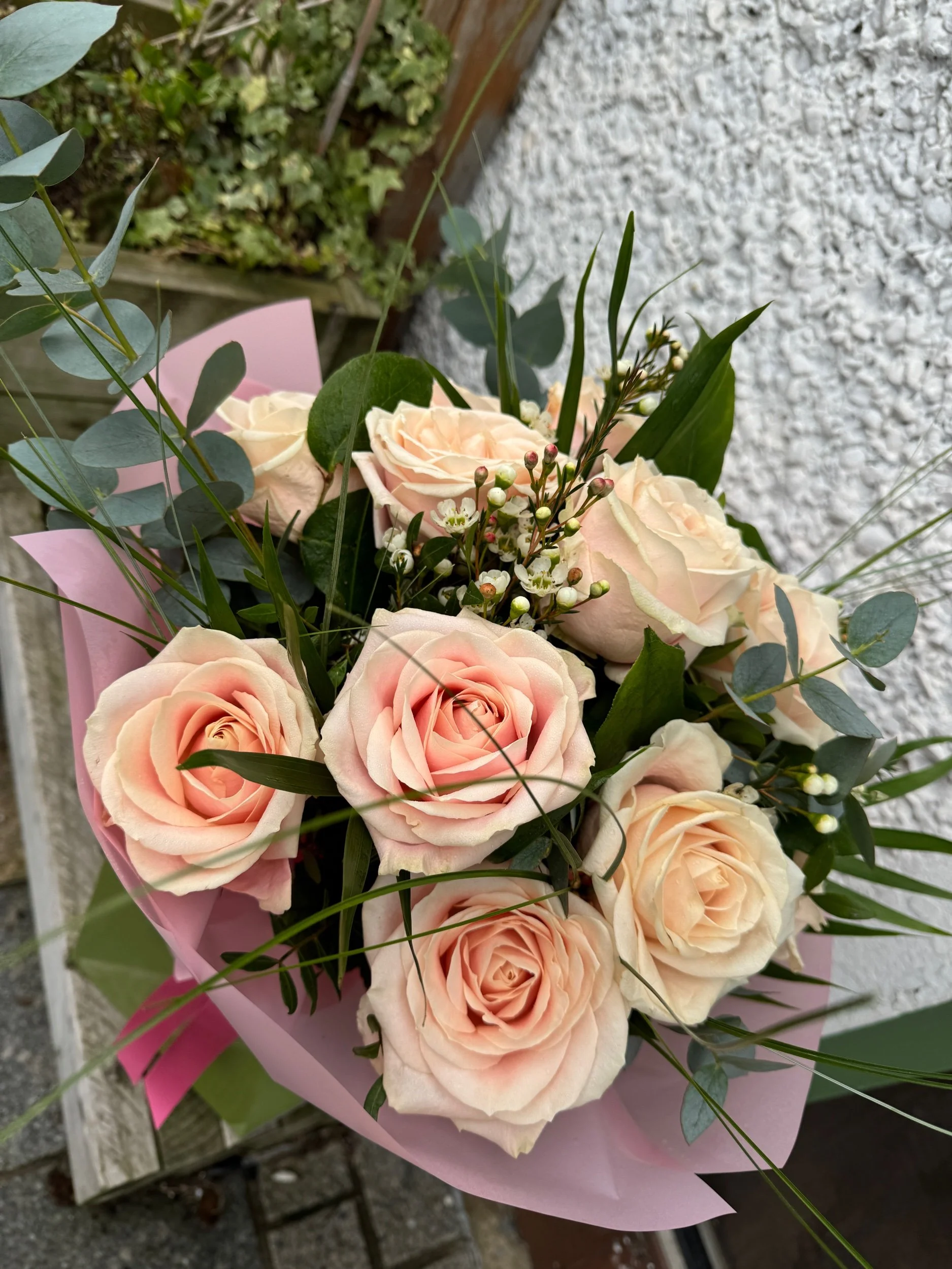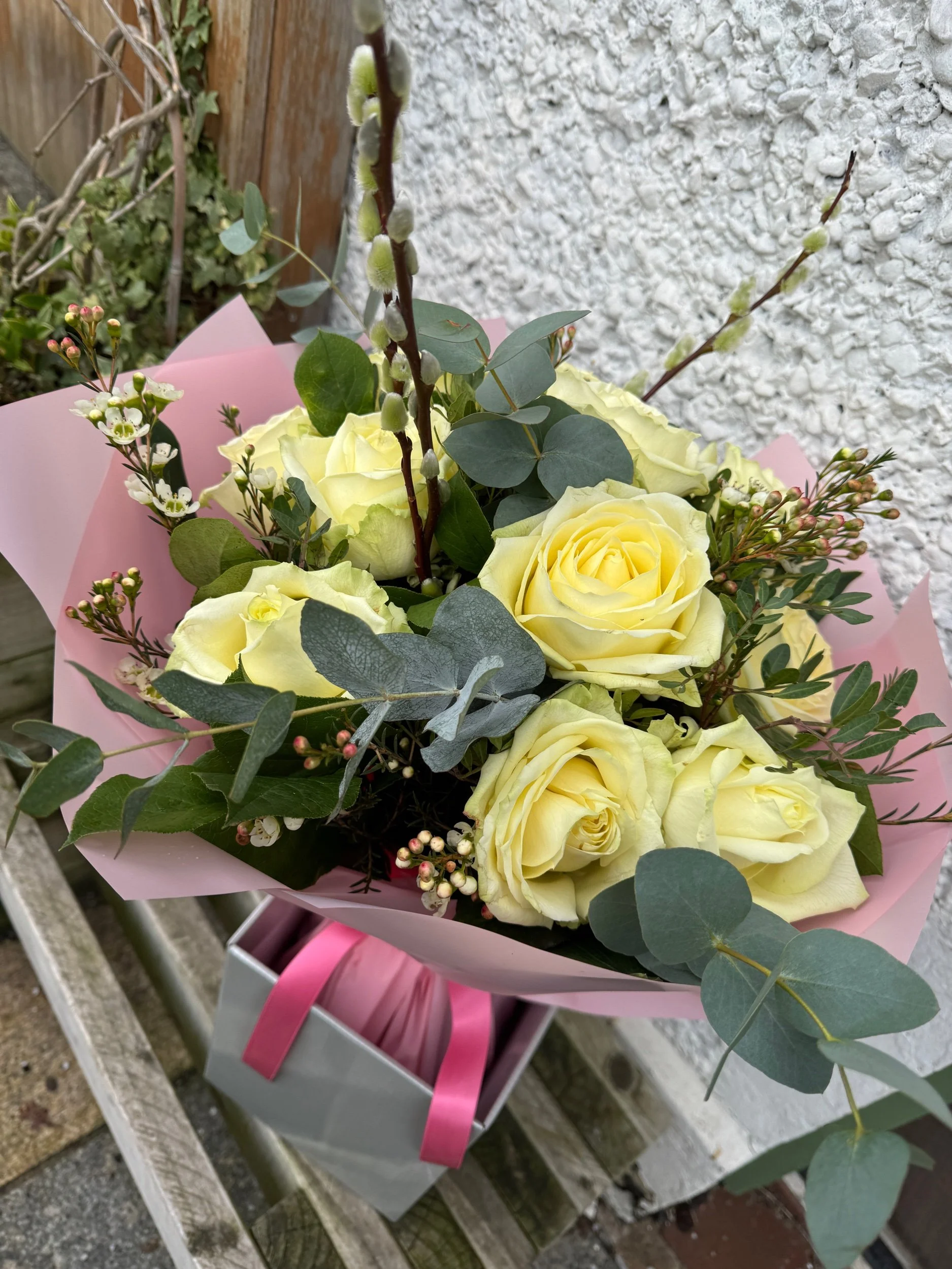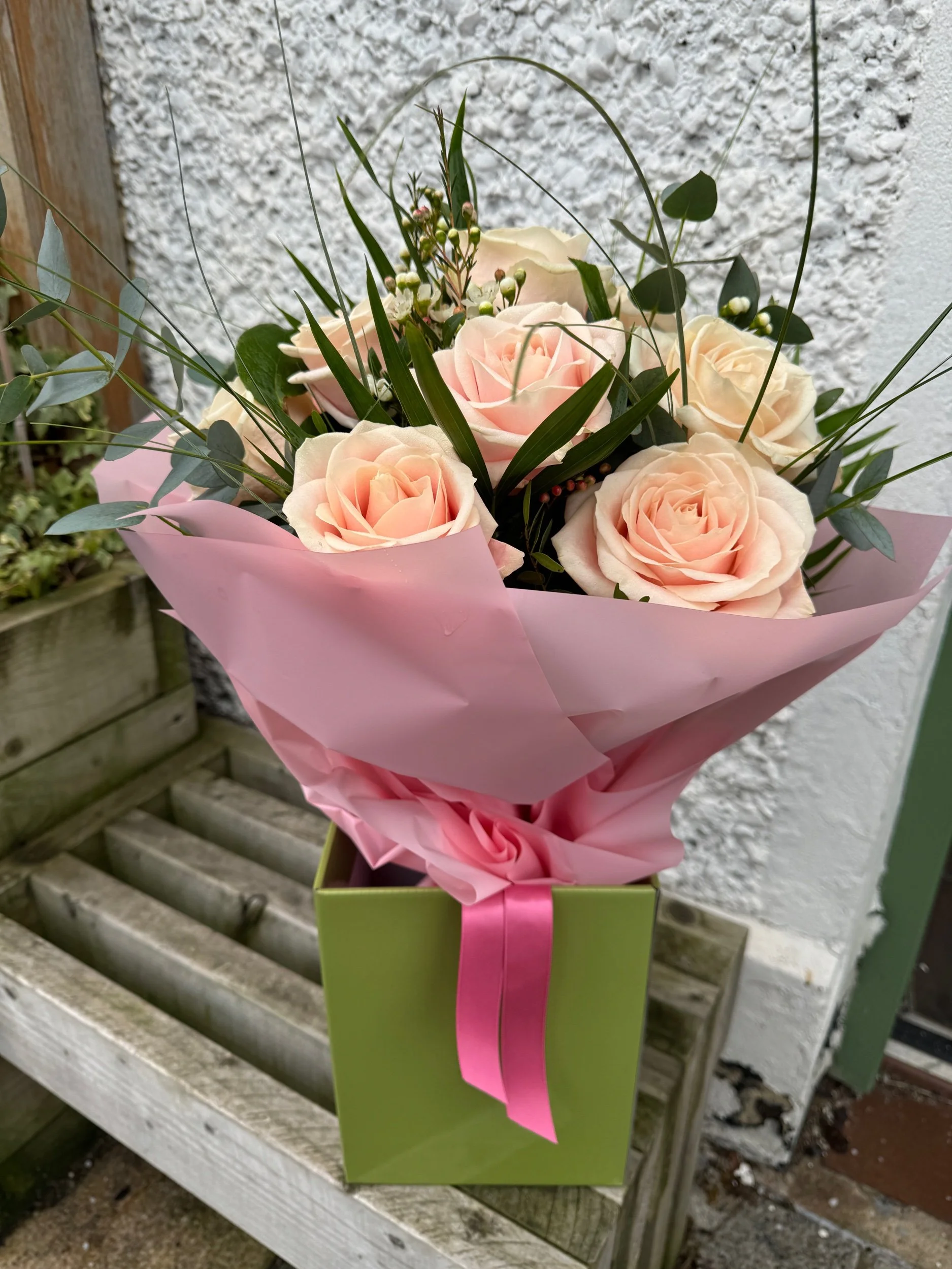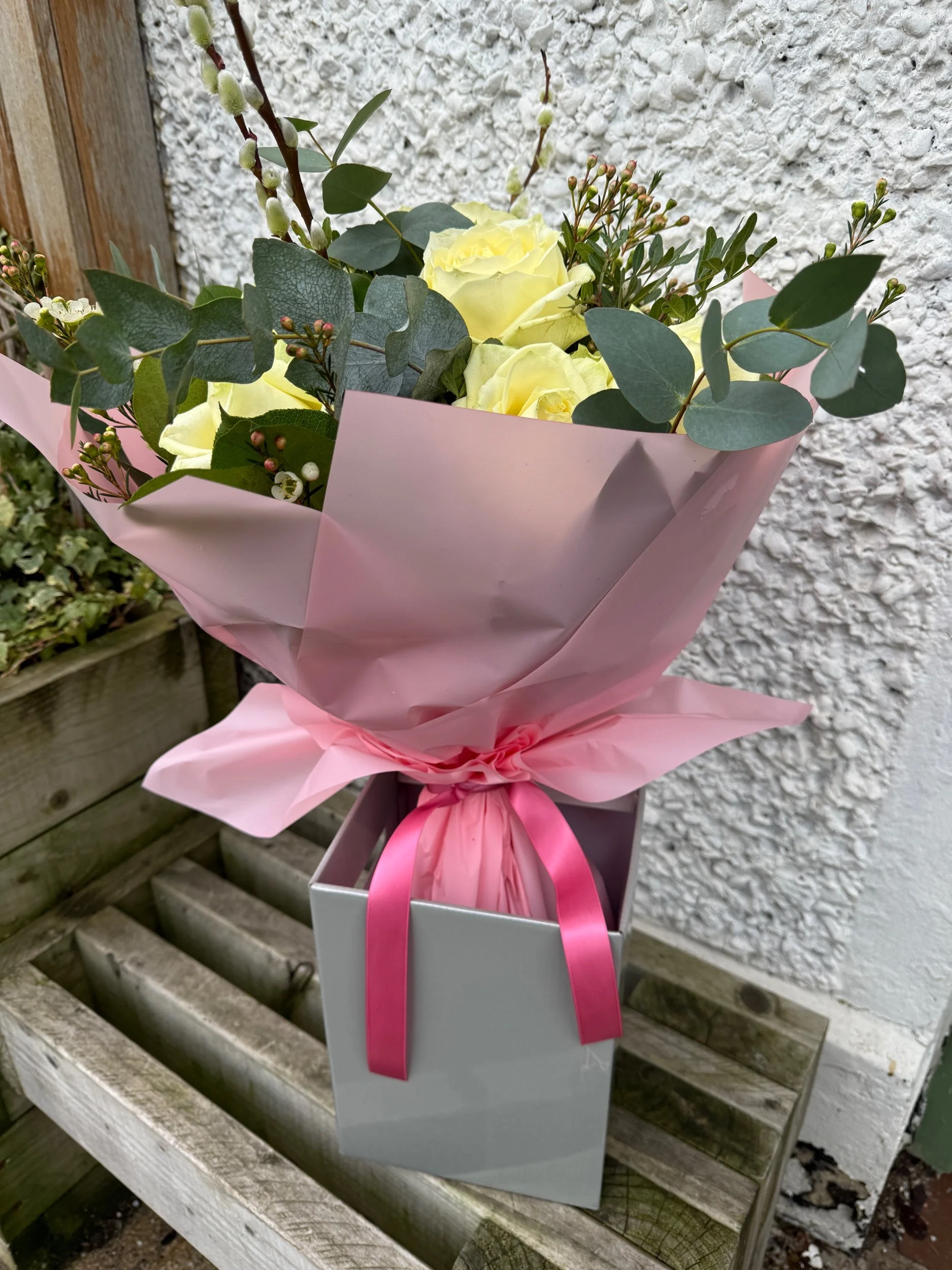 Our beautiful bouquets starting from £45 come in a water bag with flower nutrients and a box for easy transport and longer lasting blooms.