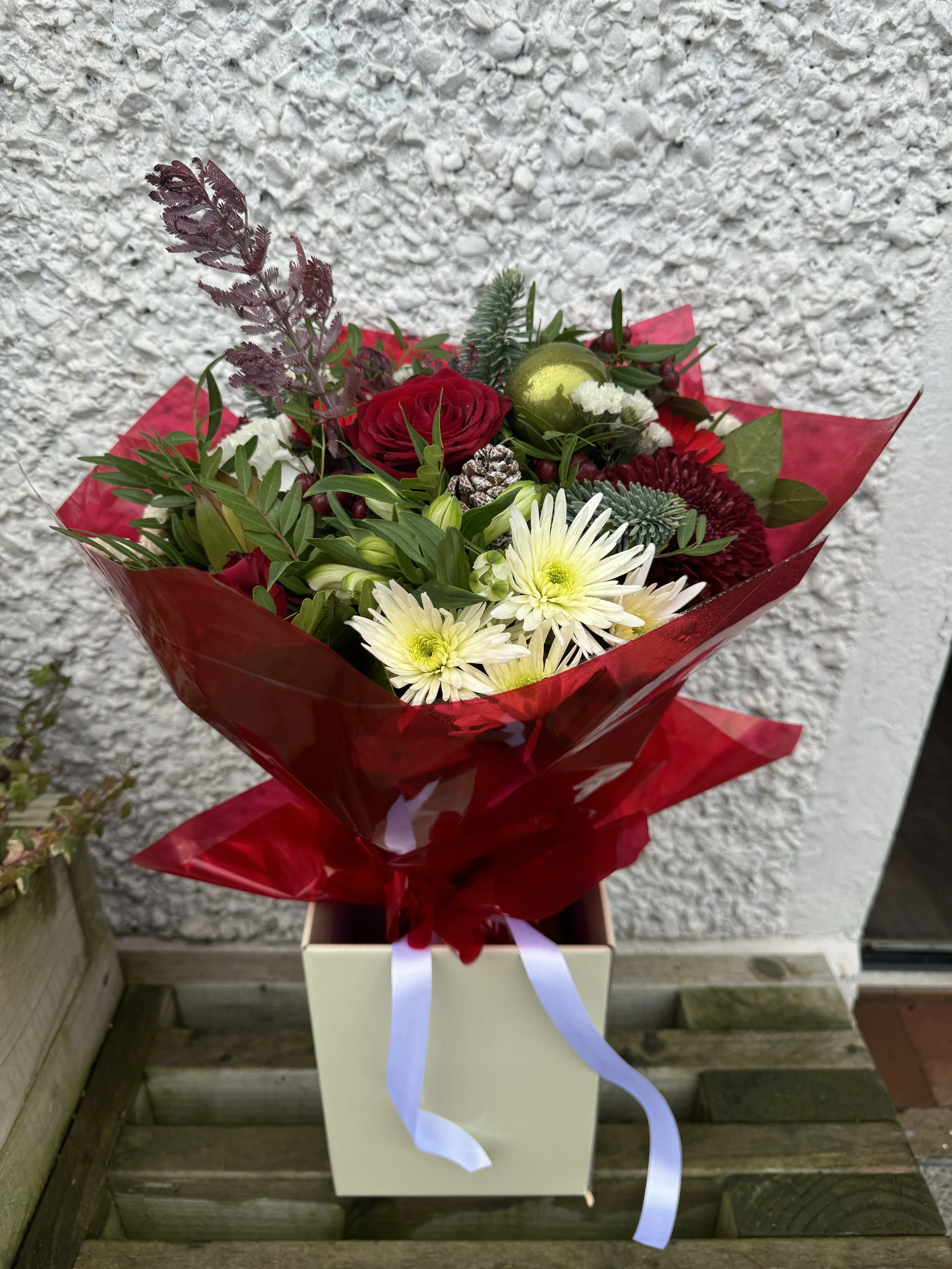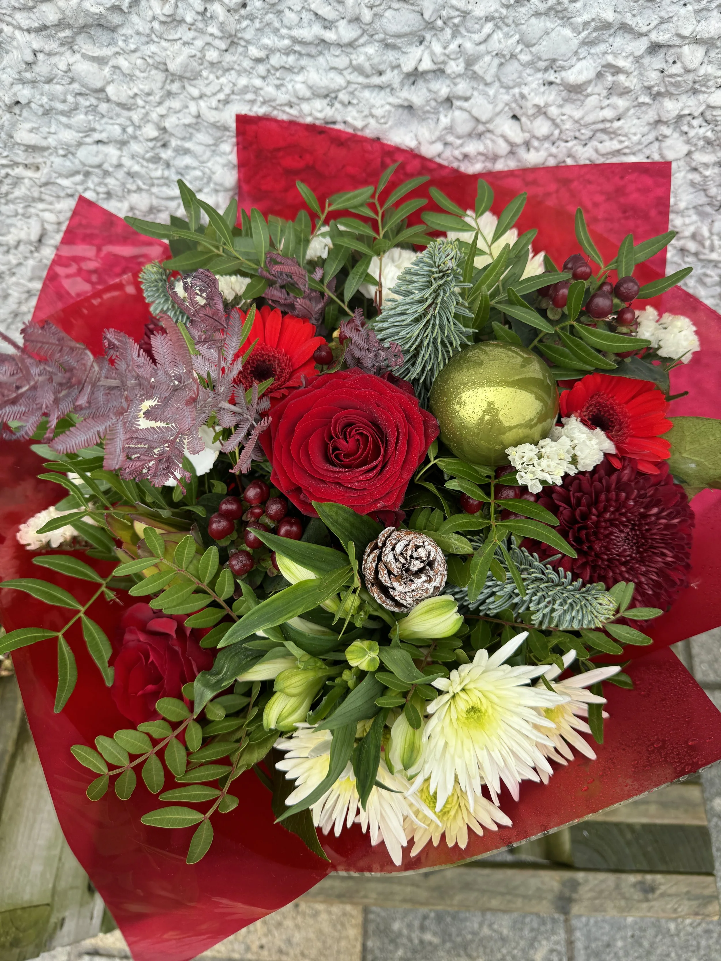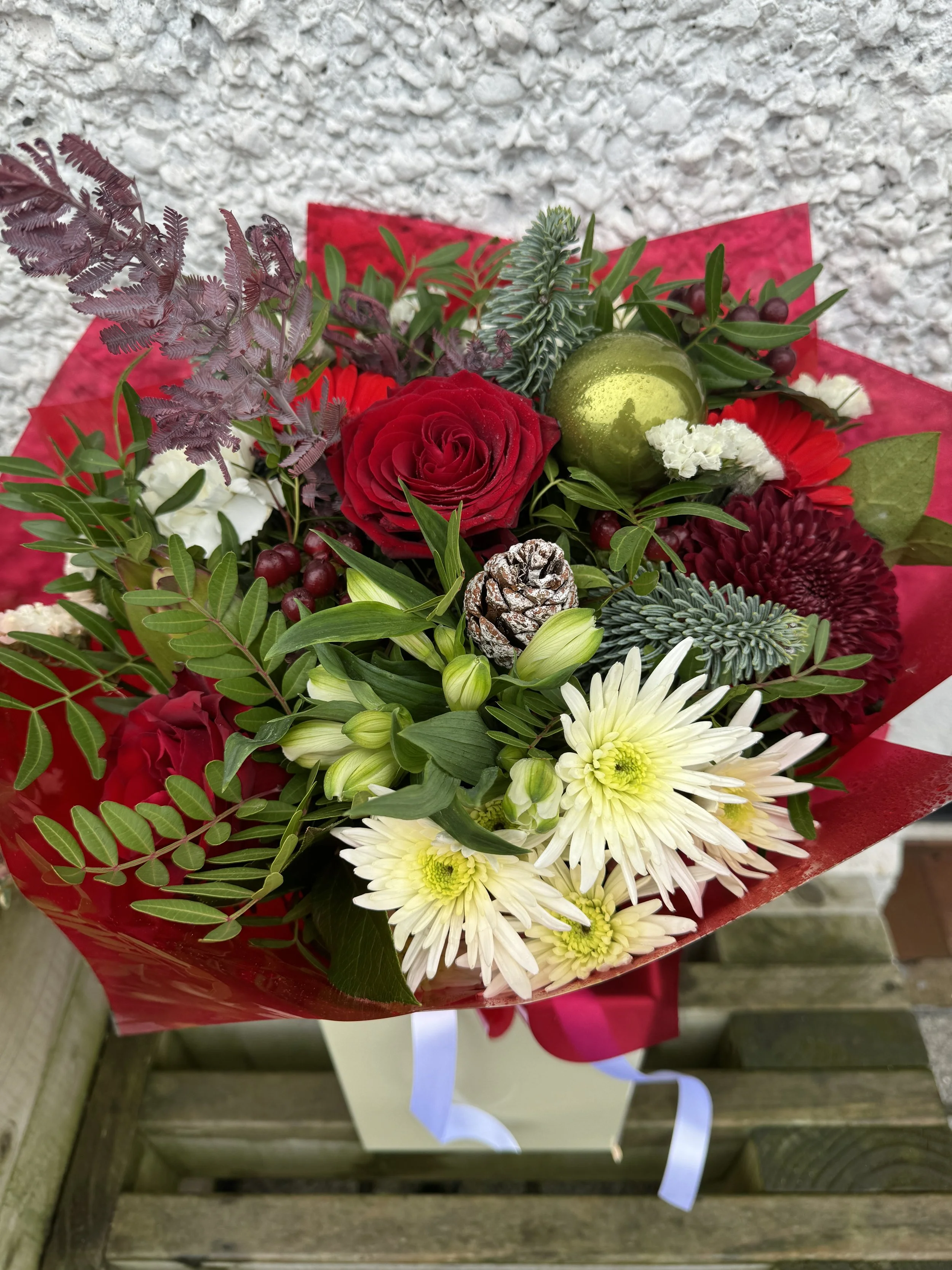 This Christmas bouquet in rich, vibrant greens, reds and golds captures the essence of a winter woodland, evoking the fresh, earthy beauty of pine forests and holiday greenery. With varying shades of deep emerald, sage, the arrangement celebrates the timeless elegance of nature during the season. The lush green tones create a sense of peace and renewal, offering a grounded, serene presence that feels both festive and calming. Ideal for those who appreciate the natural beauty of the season, this bouquet brings the spirit of the outdoors into any home, creating a fresh, invigorating atmosphere perfect for Christmas.